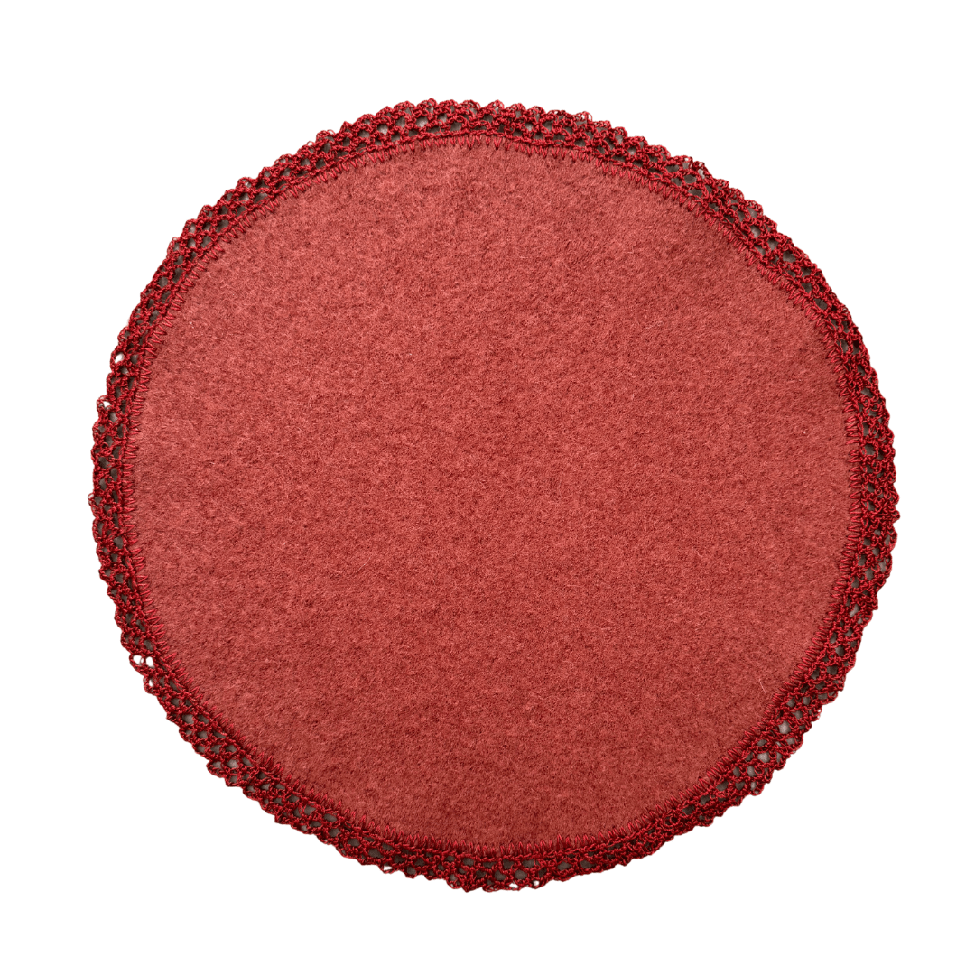 Disfruta de la elegancia de nuestro bajoplato de lana color caldero con puntilla.