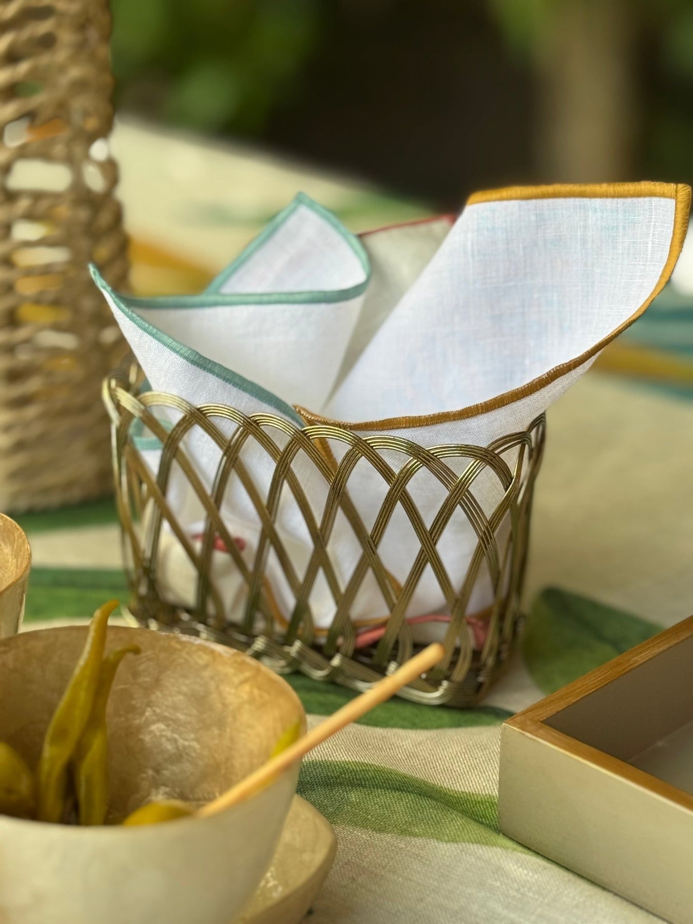 Set de 4 servilletas de cóctel de lino ivory con festón de colores.
