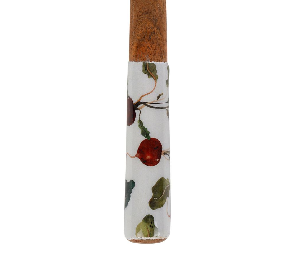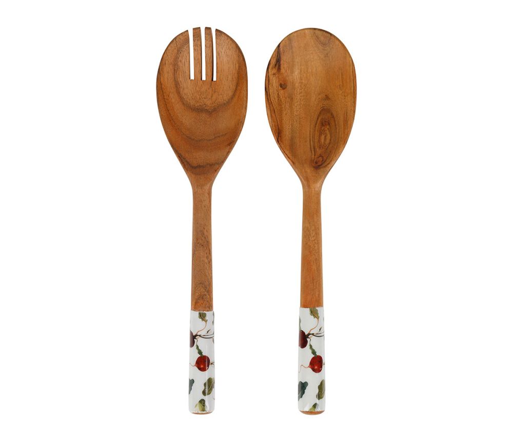 Cubiertos de servir elaborados en madera de acacia con acabado en rojo y verde. Su diseño simple y funcional añade un toque de color natural a la mesa, ideal para ensaladas y platos compartidos.