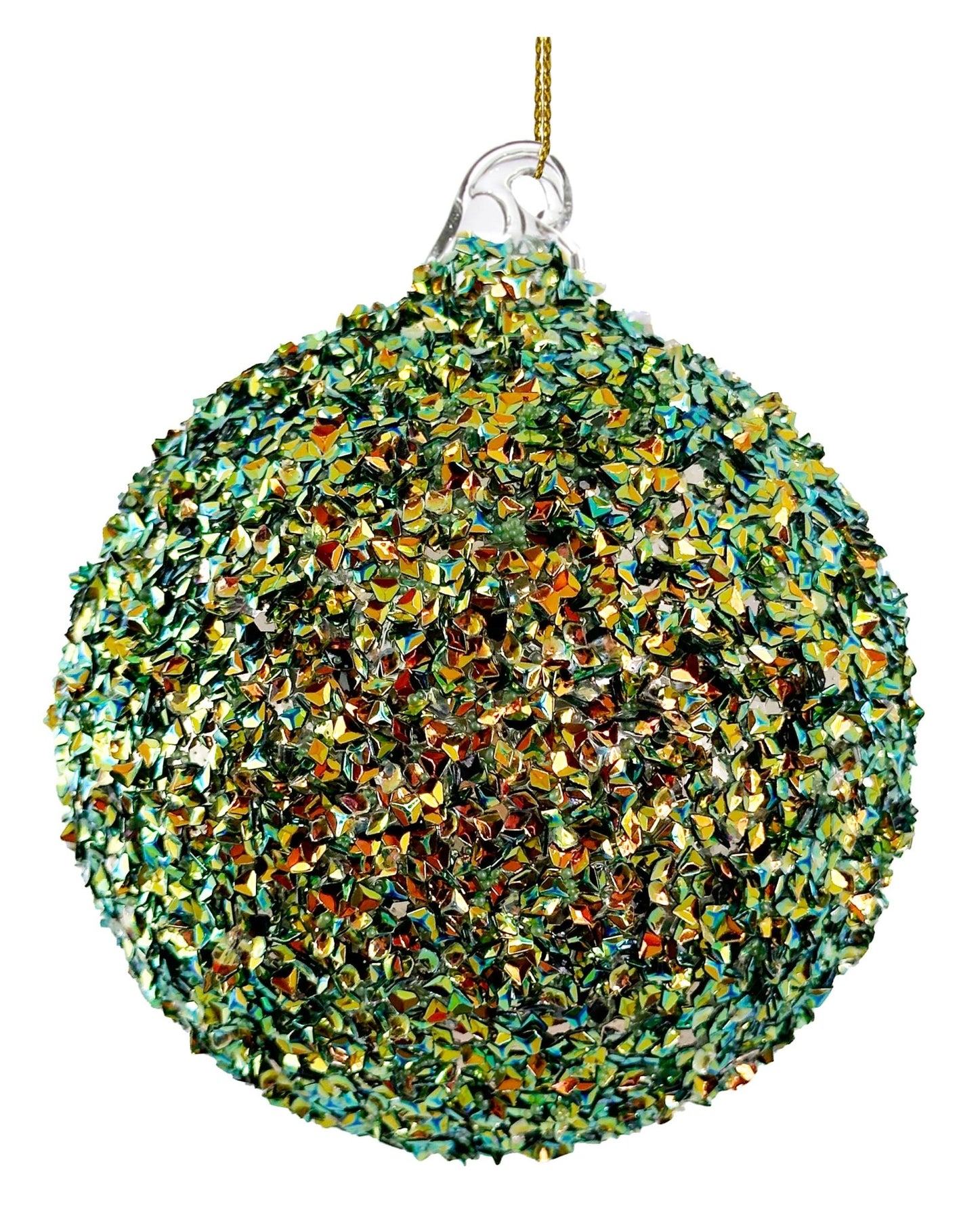 Esta esfera de vidrio está completamente recubierta de glitter en tonos verde esmeralda y dorado, creando un efecto centelleante que capta la luz desde todos los ángulos.