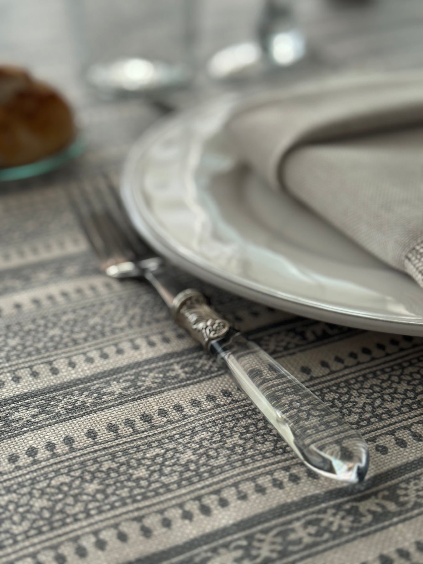 En La Compañía Francesa nos gusta hacer manteles cuadrados para mesas redondas, ya que lucen más sofisticados y modernos.