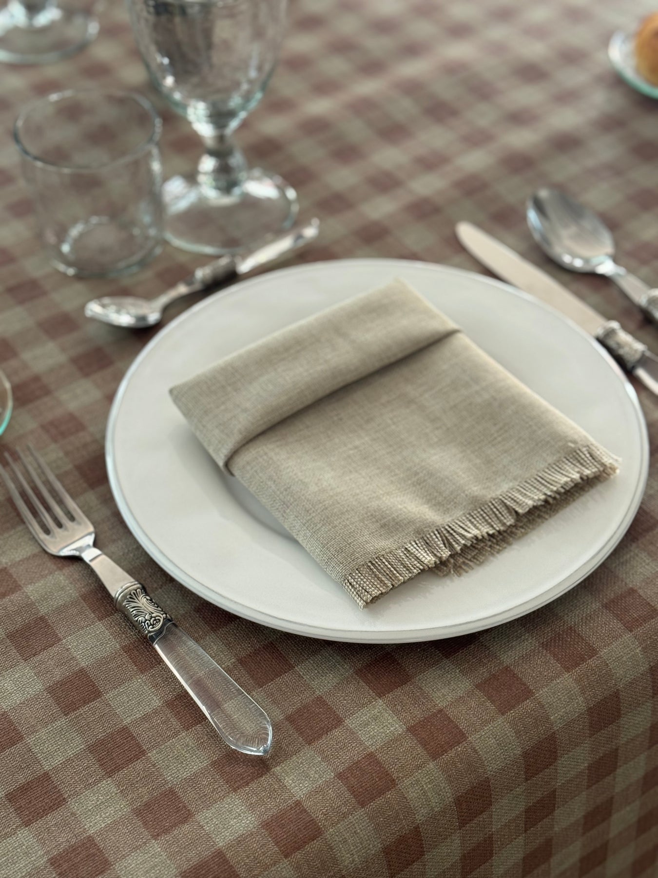En La Compañía Francesa nos gusta hacer manteles cuadrados para mesas redondas, ya que lucen más sofisticados y modernos.