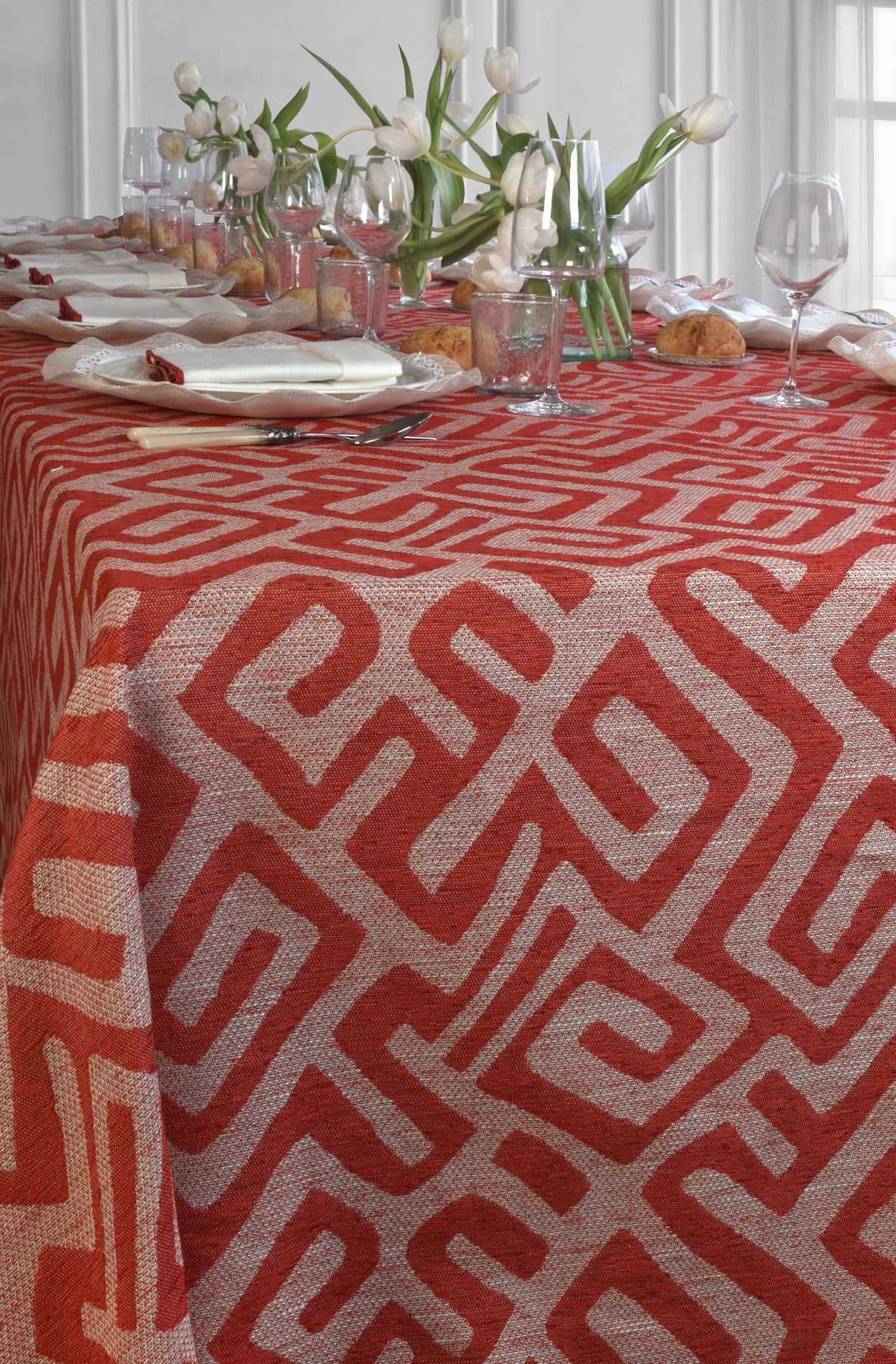 Un tejido con textura natural, fabricado en Florencia, que realza los estampados y viste la mesa con presencia.