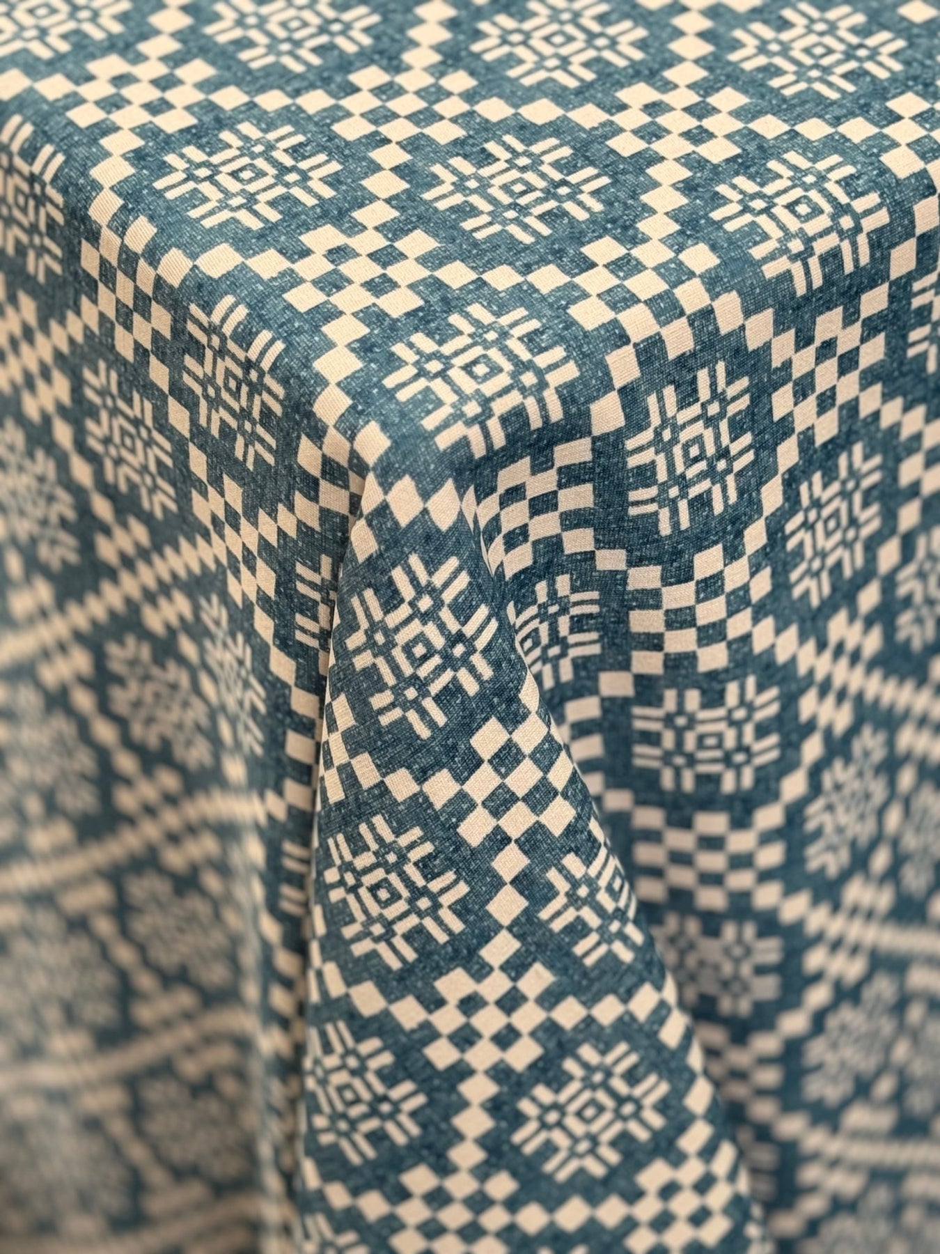 Seleccionamos lino y algodón de procedencia noble, trabajados en telares de precisión para lograr una caída fluida y un tacto sedoso reservado a las mesas más distinguidas.