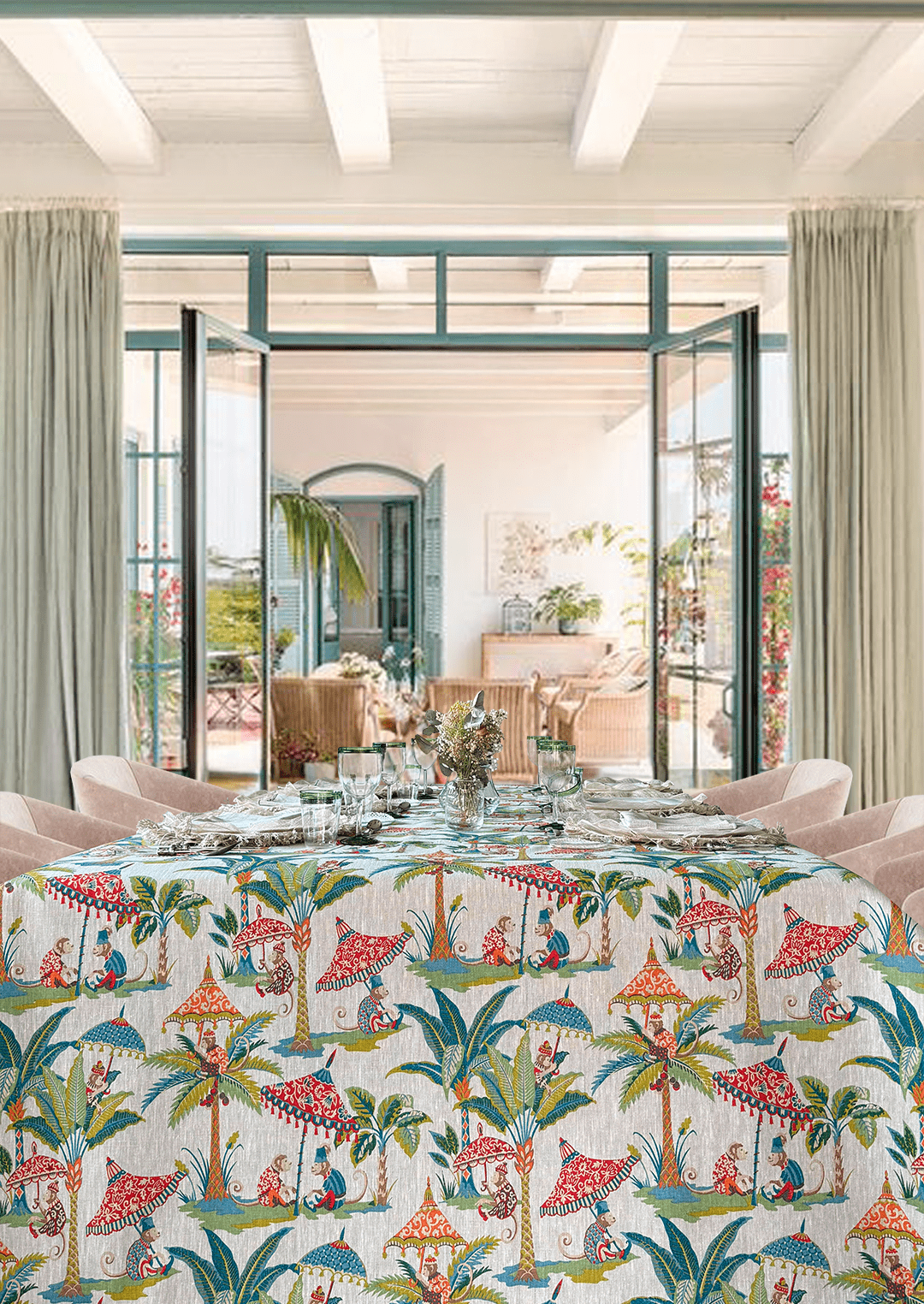 En La Compañía Francesa confeccionamos manteles cuadrados para mesas redondas porque resultan más actuales, frescos y elegantes.