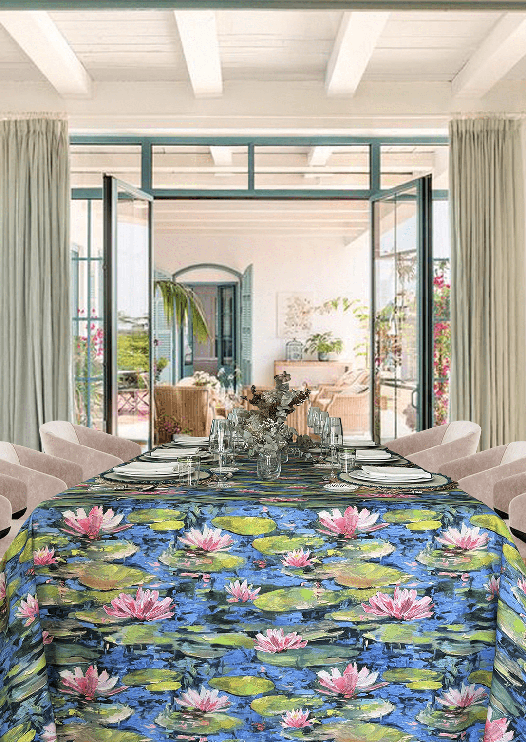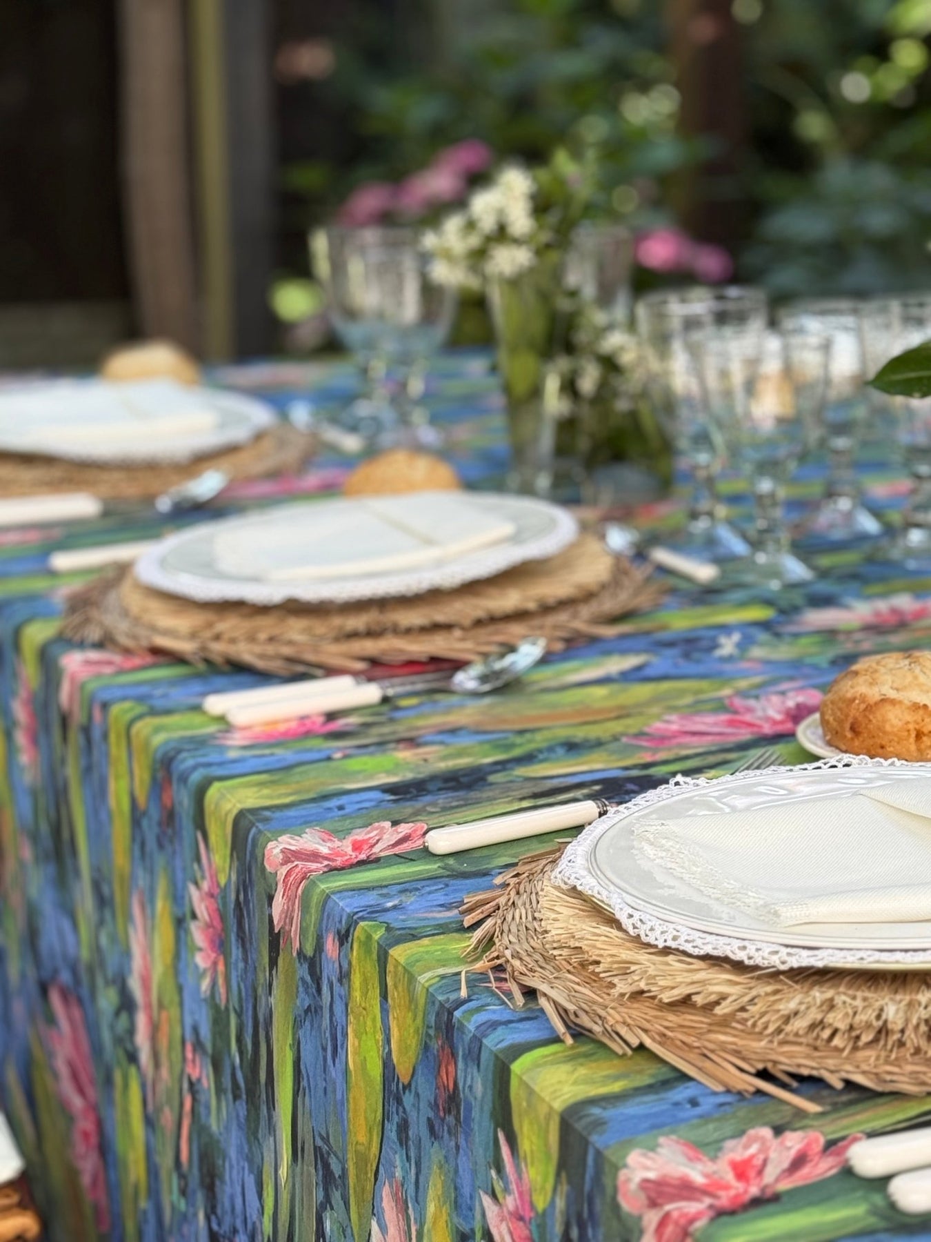 En La Compañía Francesa confeccionamos manteles cuadrados para mesas redondas porque resultan más actuales, frescos y elegantes.