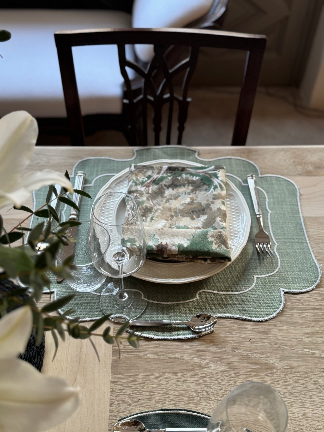 Elegantes manteles individuales ovalados en color verde eucalipto con festón beige.
