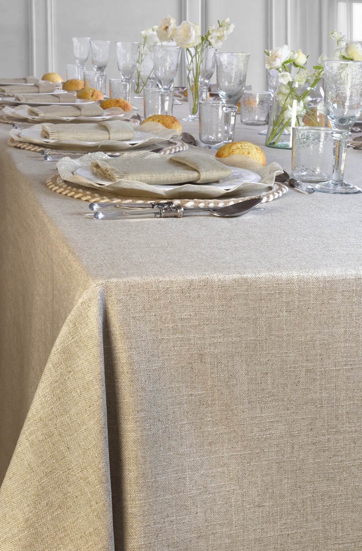 En La Compañía Francesa nos gusta hacer manteles cuadrados para mesas redondas, ya que lucen más sofisticados y modernos.