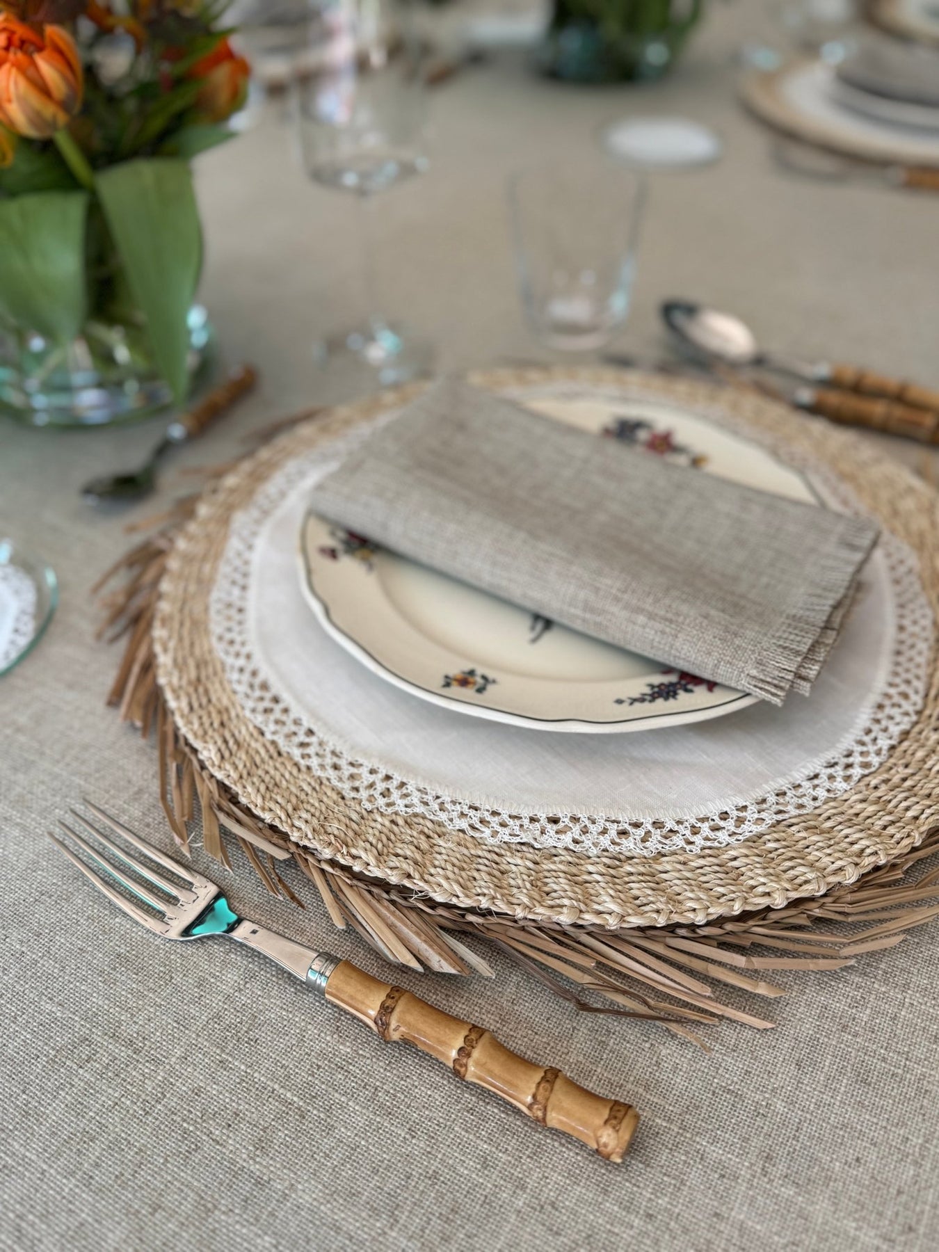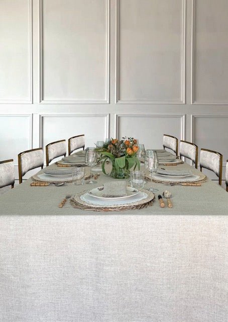 En La Compañía Francesa confeccionamos manteles cuadrados para mesas redondas porque resultan más actuales, frescos y elegantes.