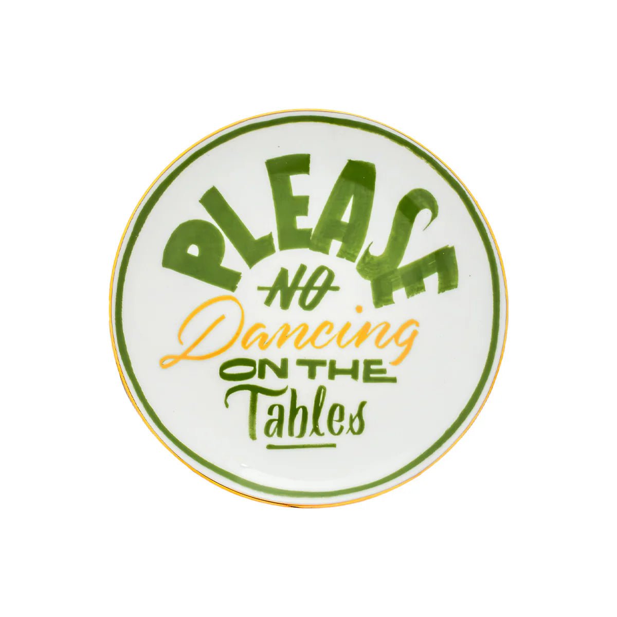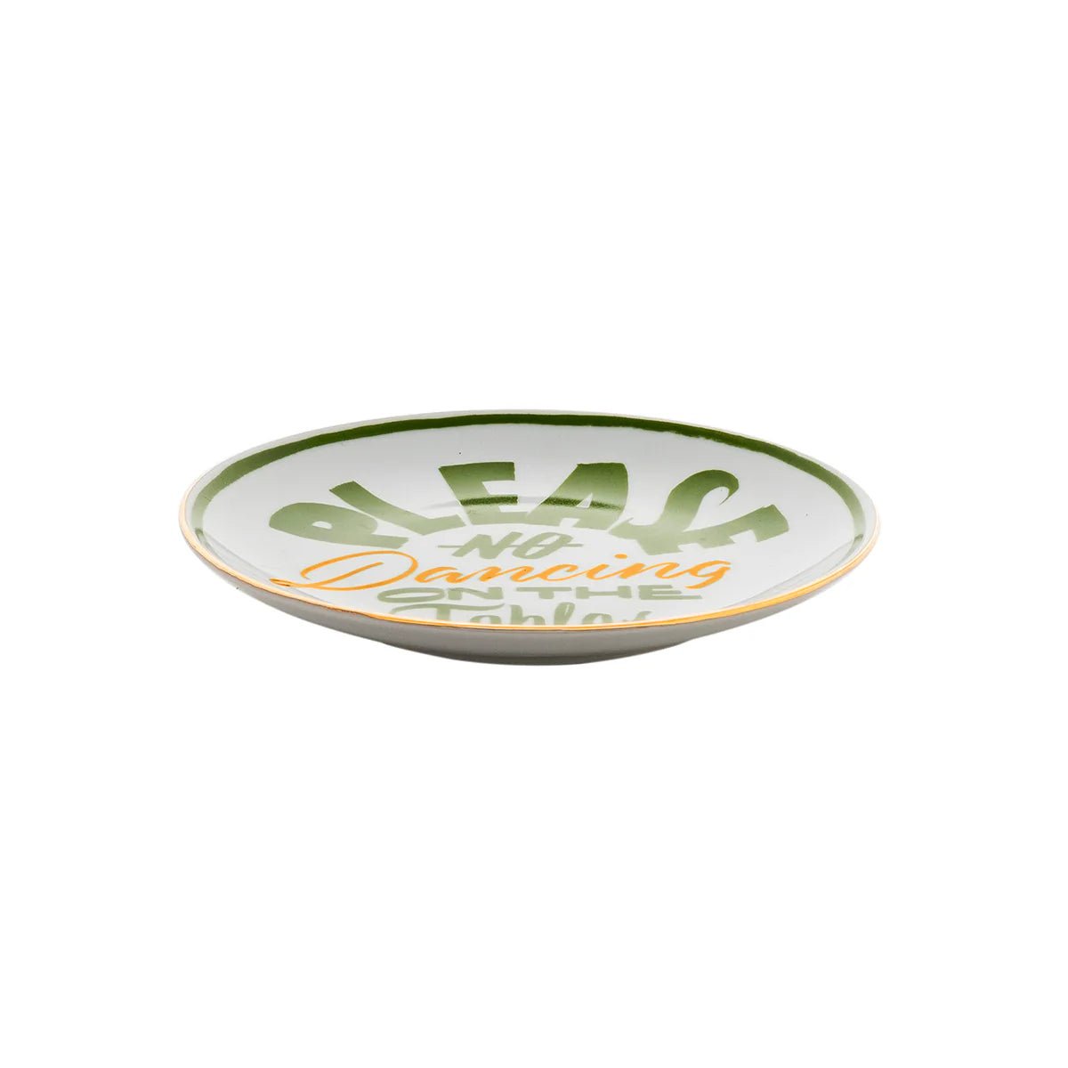Colorido plato llano y ovalado con motivo alegre de celebración en los bordes.