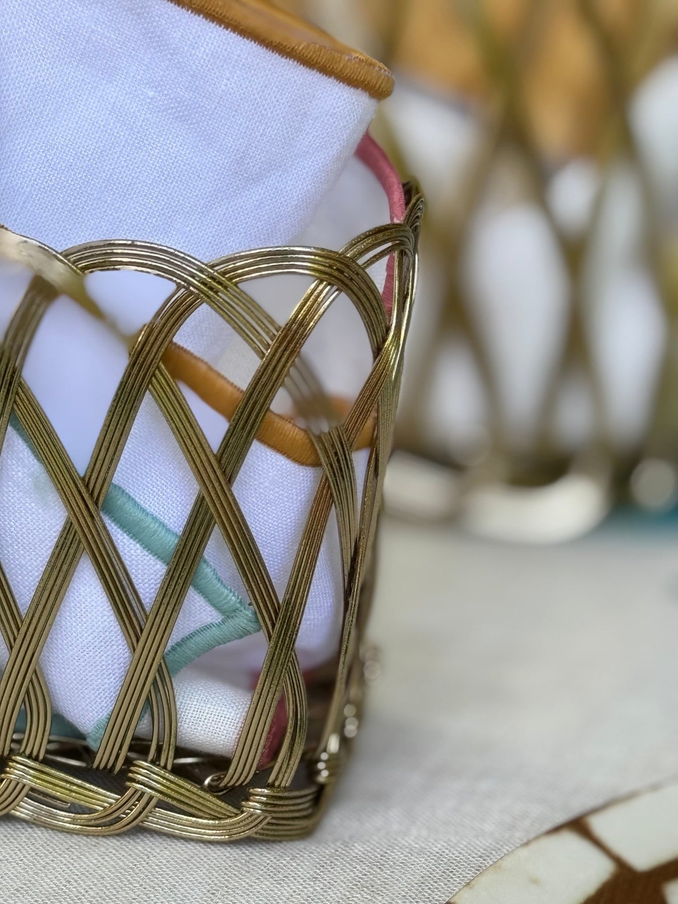 Esta sofisticada cesta metálica con acabado dorado combina diseño y funcionalidad en una pieza única. Su estructura entrelazada crea un patrón ligero y aireado, ideal para exhibir frutas, panes o como un elegante centro de mesa.
