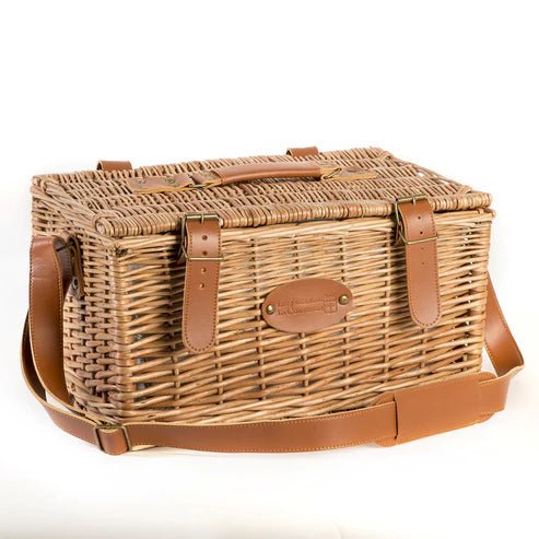Cesta de picnic Trianon para 2 personas, con un estilo campestre y vintage encantador. Tejida a mano en mimbre natural, con interior escocés impermeable y detalles en cuero. Un clásico para tus salidas al aire libre.