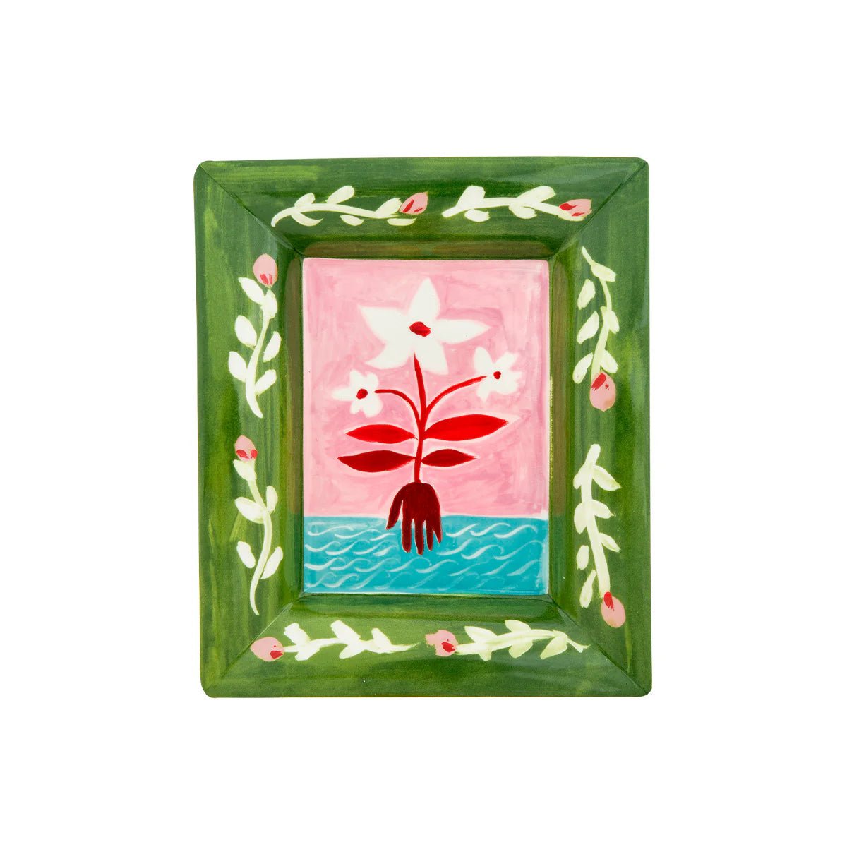 Vibrante vacíabolsillos con motivo floral estilizado en tonos cálidos y enmarcado por un borde verde.