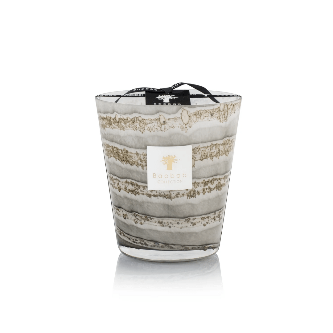 Las capas horizontales del vidrio soplado artesanalmente forman rayas salpicadas de pequeños destellos redondos y orgánicos. La vela perfumada Atacama es un objeto refinado y único, ideal para interiores urbanos y chic.